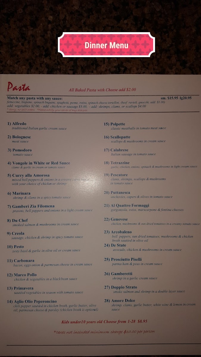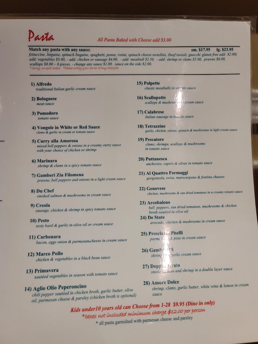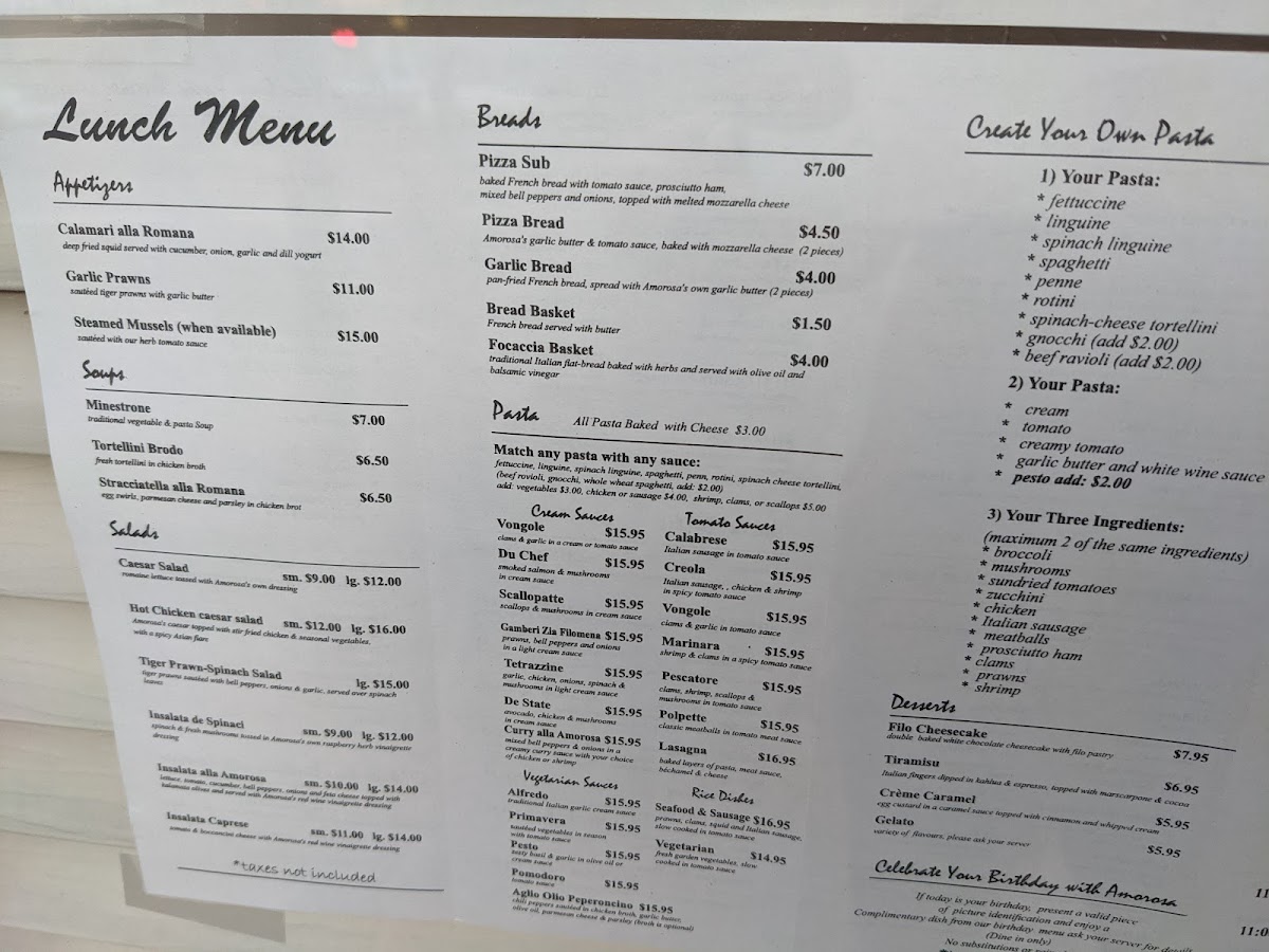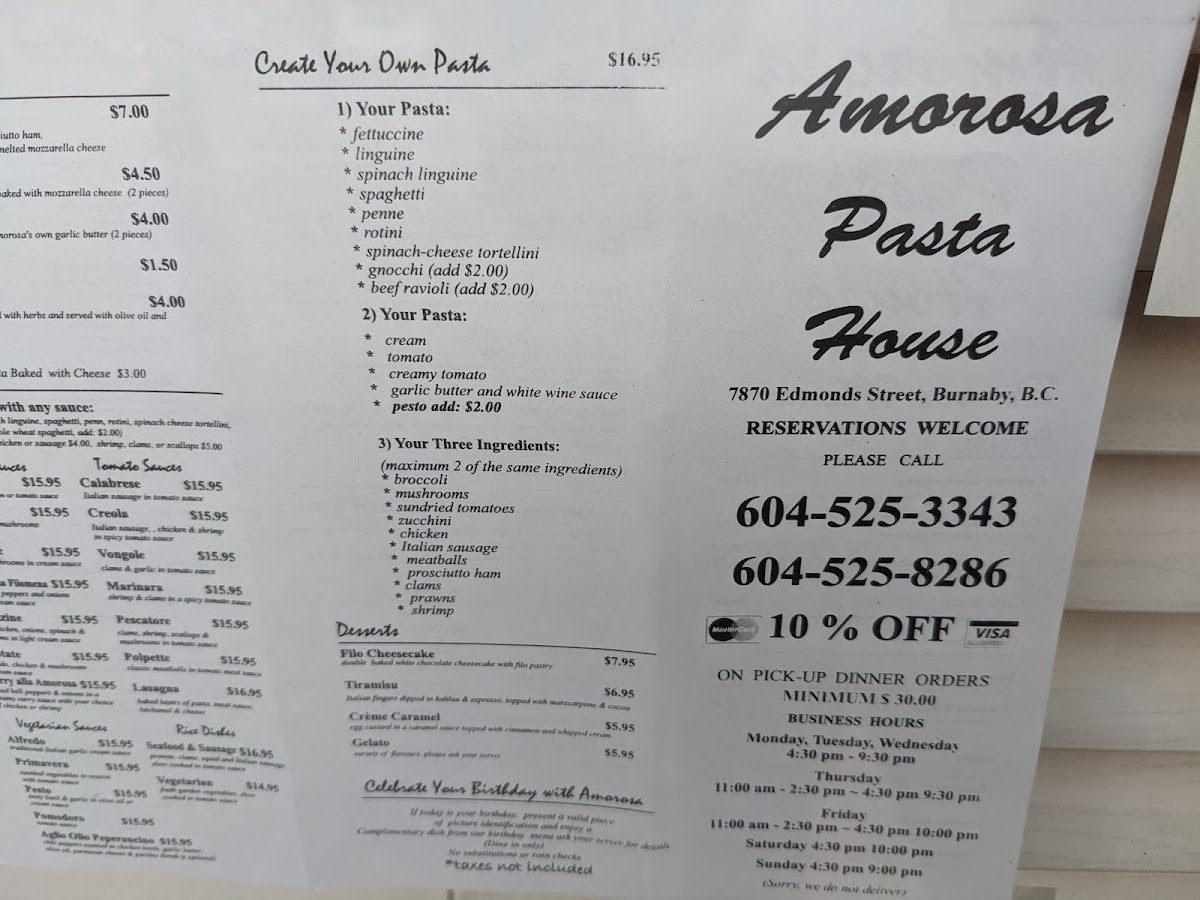Amorosa Pasta House Menu